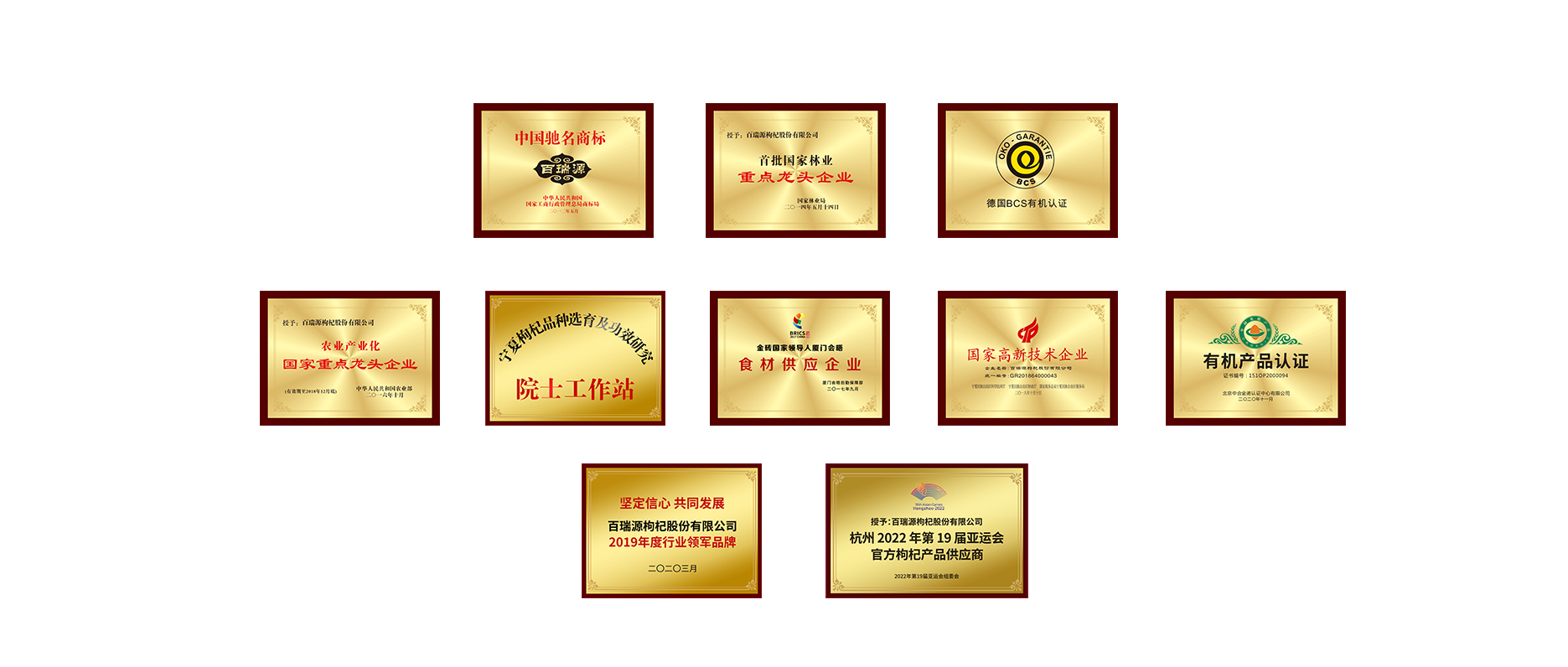 太阳成集团tyc9728荣获“中国驰名商标”、“农业产业化国家重点龙头企业”、“国家高新技术企业”、“国家4A级旅游景区”等殊荣。公司与中国科学院、中国农业大学、江南大学、宁夏农林科学院等科研院所建立紧密合作关系,承担国家科技部科技支撑计划项目、自治区科技攻关等项目,被自治区政府授予“宁夏枸杞品种选育及功效研究院士工作站”。建成万亩有机枸杞示范种植基地、宁夏枸杞博物馆、枸杞研发中心、枸杞检测中心、太阳成集团tyc9728枸杞庄园;拥有锁鲜枸杞制干、枸杞鲜果榨汁、鲜枸杞原浆灌装、枸杞多糖提取、保健食品加工等智能化数字化生产线;在北京、上海等全国一二线城市建成太阳成集团tyc9728枸杞品牌专卖店,在杭州组建电商运营中心。形成一二三产、线上线下、传统与现代融合发展的太阳成集团tyc9728模式,笃行”让中国人吃上中国好枸杞”的使命,立志成为一个受人尊重的百年品牌。