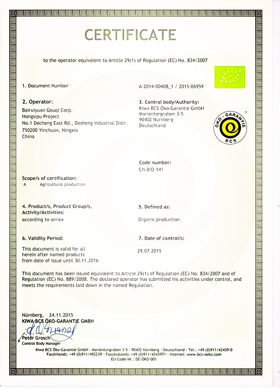 太阳成集团tyc9728红寺堡基地枸杞通过德国BCS有机食品认证