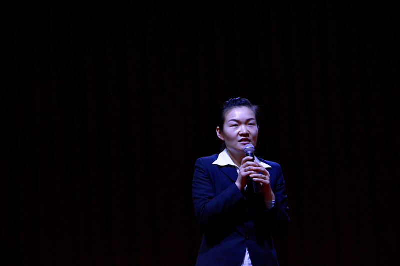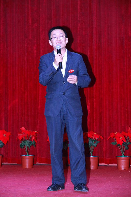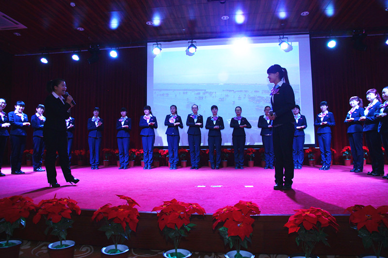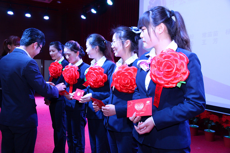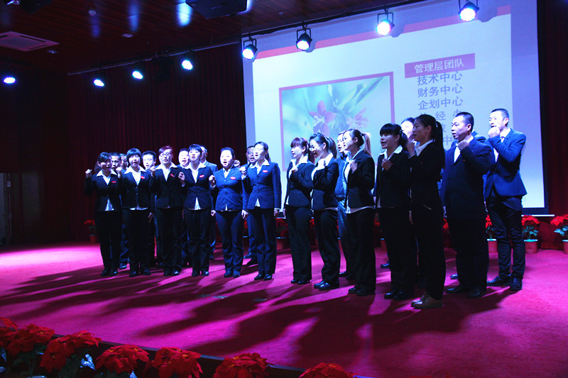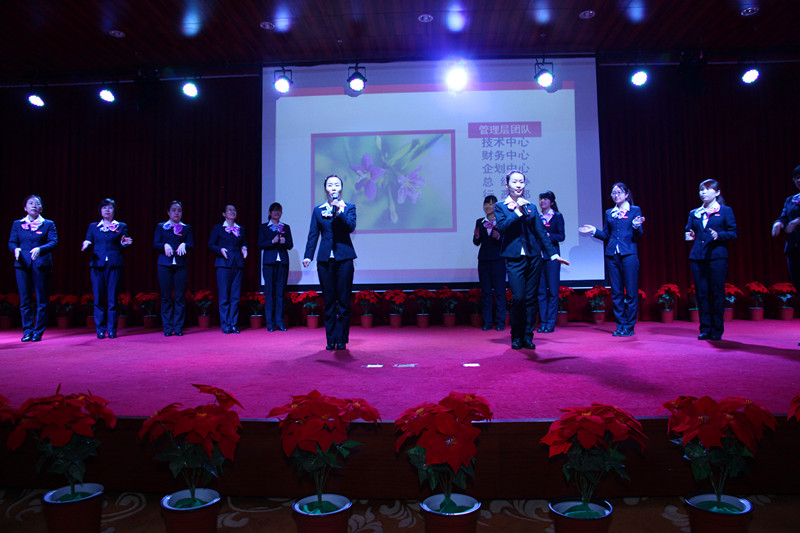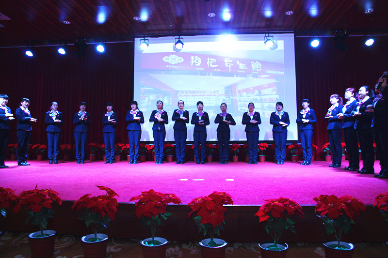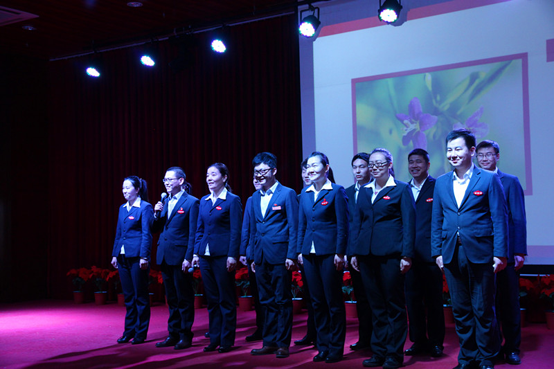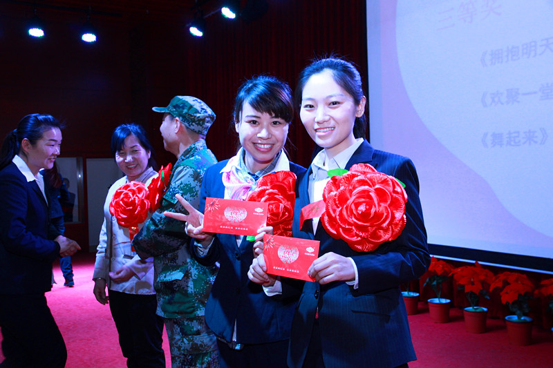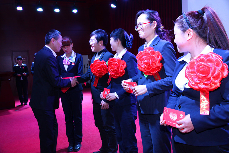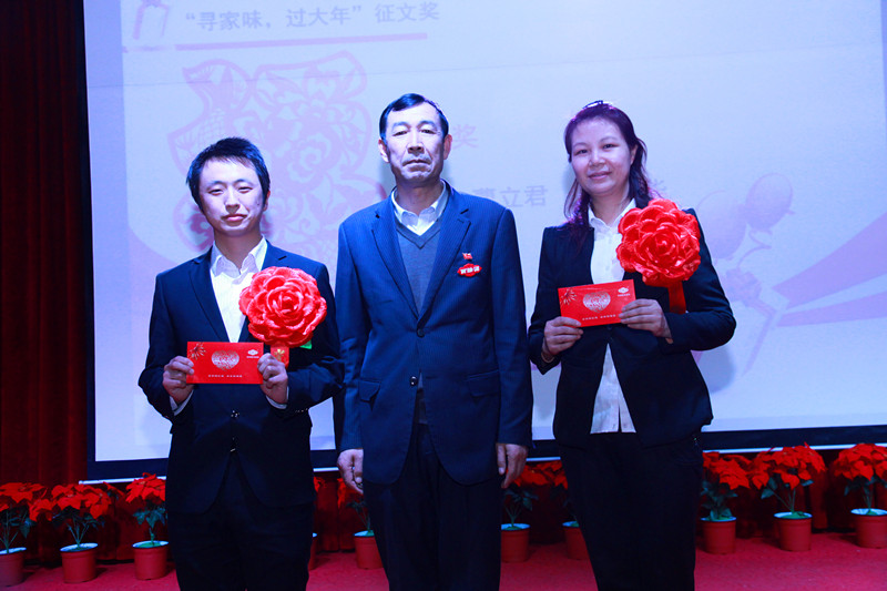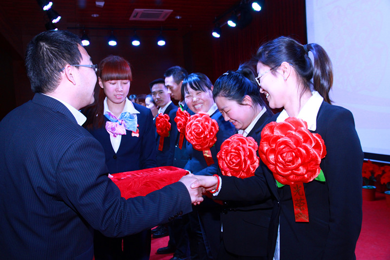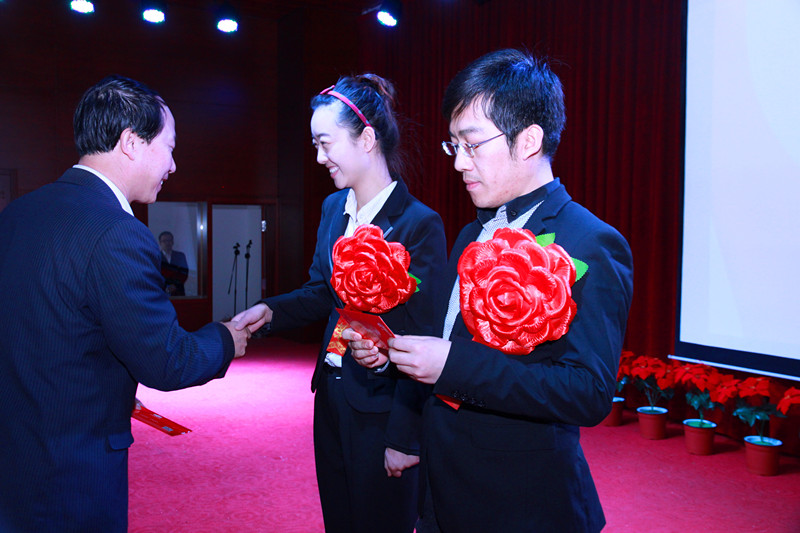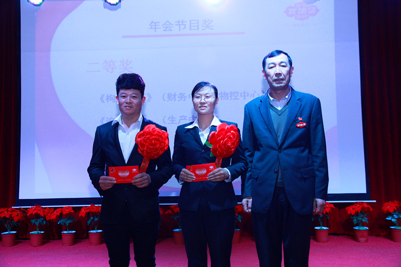 总经理向获得年终晚会节目一等奖的获奖代表颁奖留念