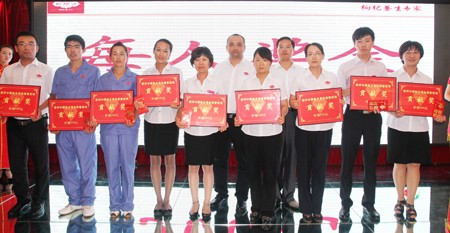 图为公司董事长郝向峰先生为常务副总经理姚卫鹤先生(左一)和品牌运营部经理唐桂莉女士(右一)颁发突出贡献奖并合影留念