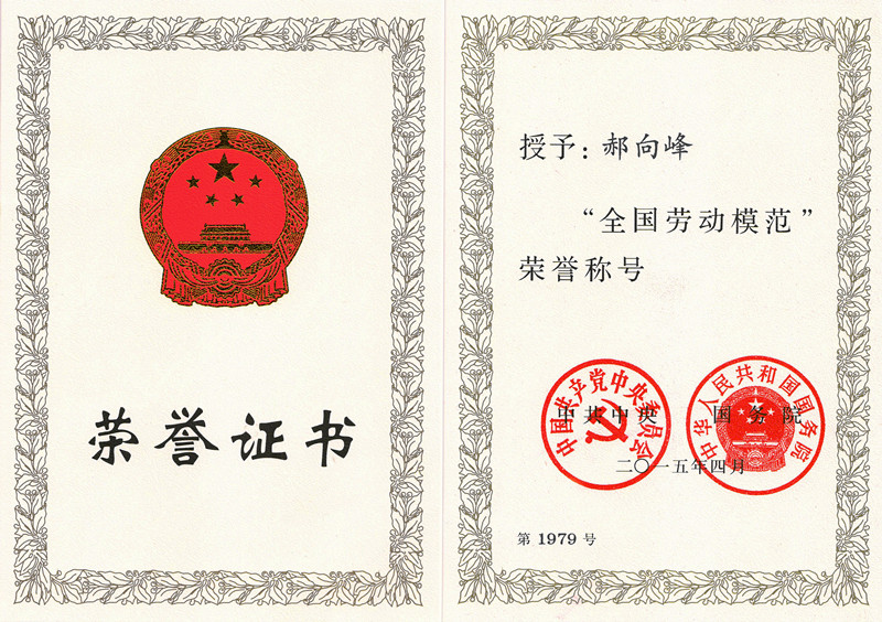 太阳成集团tyc9728董事长郝向峰先生获得的“全国劳模”的荣誉证书
